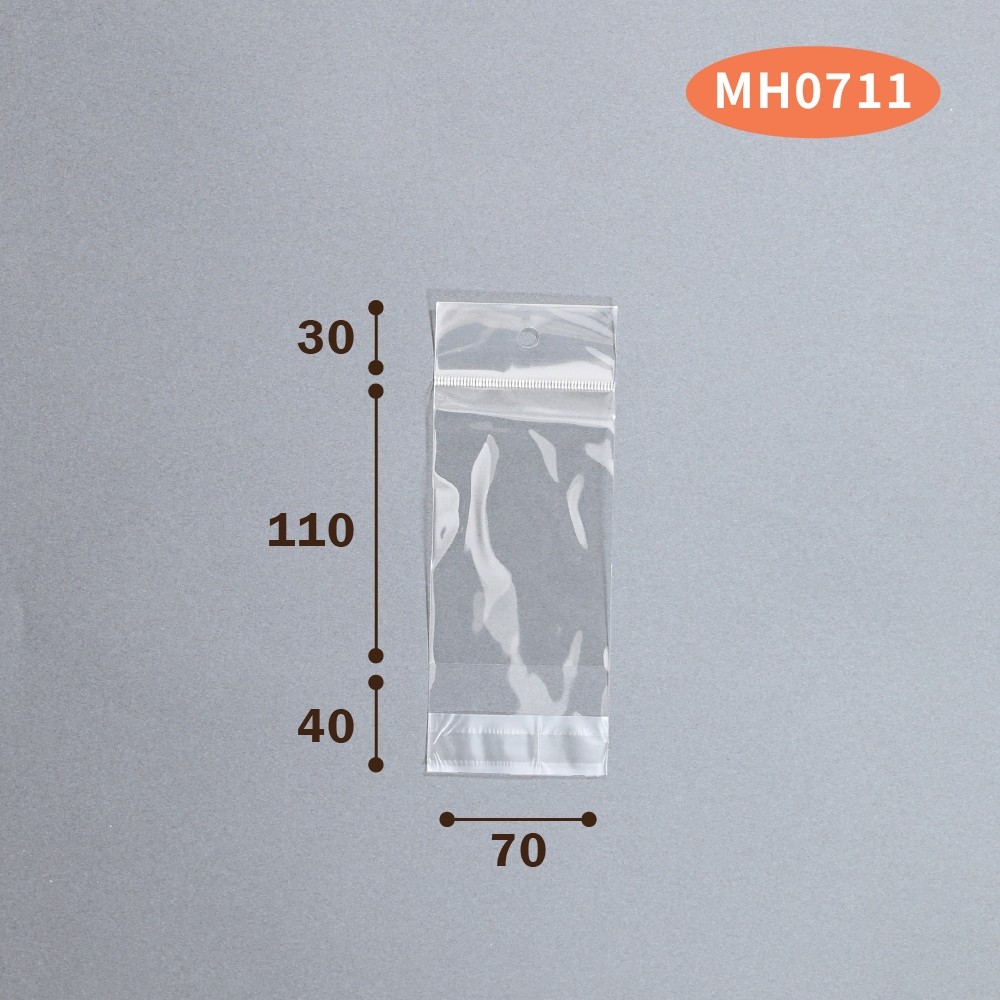 | 透明ヘッダーフィルム袋 テープ付 MH0711 | OPP | 100枚 | #40 | 70mm | 110mm | 30mm | 40mm | 443円→222円 |