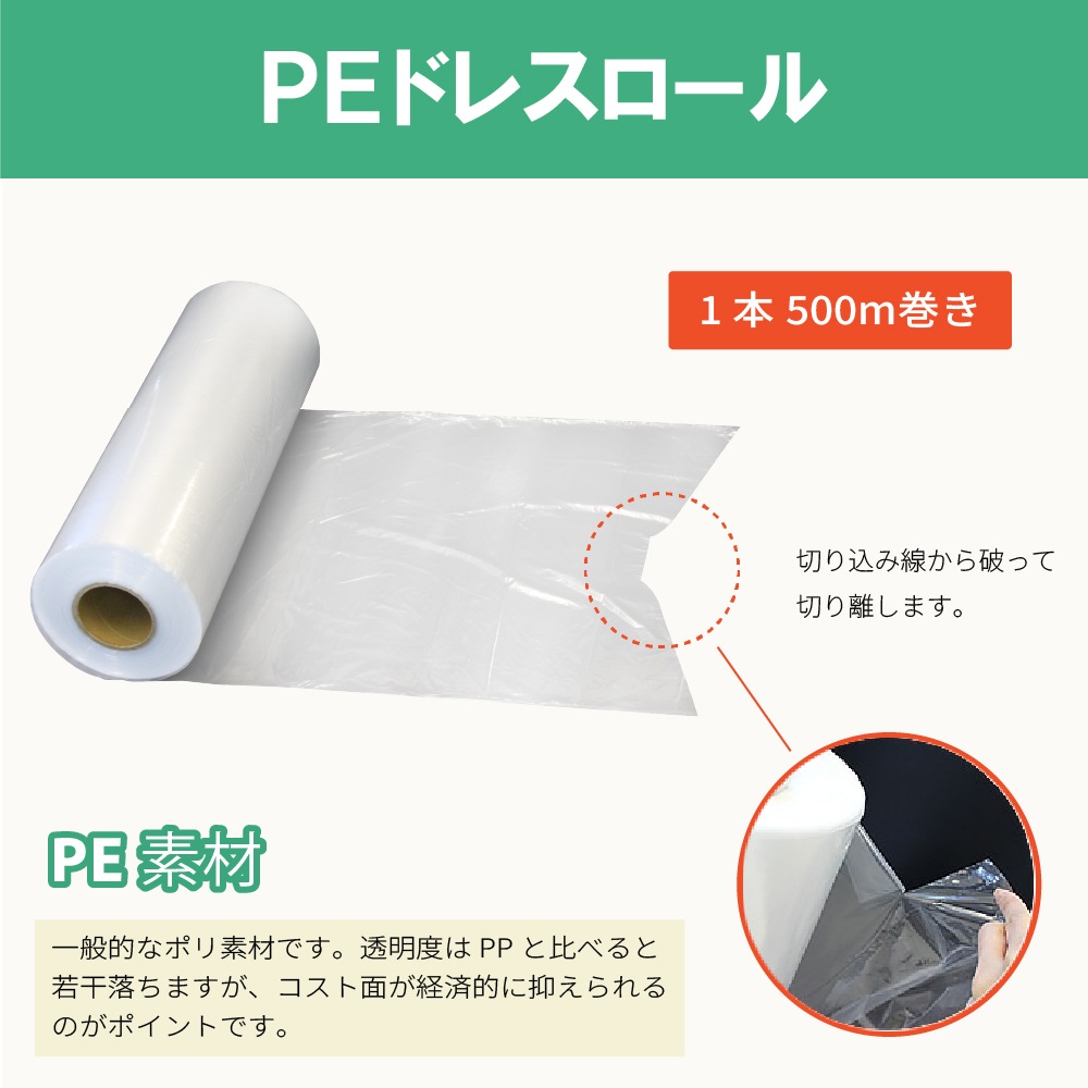 | PEドレスカバーロールタイプ PE55150R | PE#22 | 550×1500 (mm) | 333枚 | 8,259円 |