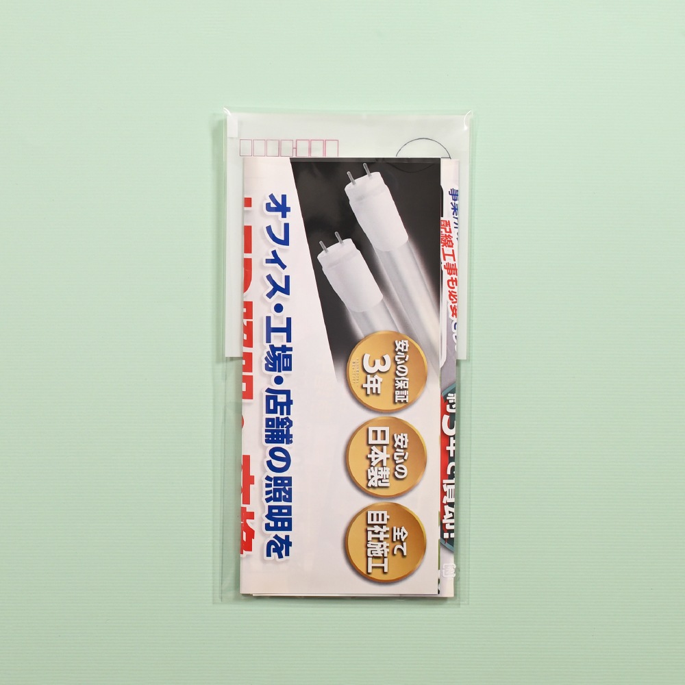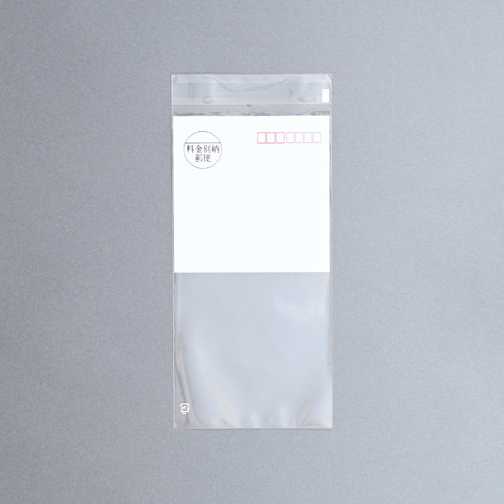 ビニール封筒、透明封筒、フィルム封筒とも呼ばれ、ダイレクトメール(DM)によく使われます。